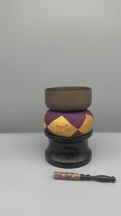 A medium sized vintage Japanese orin, also known as a singing bowl. This piece includes a purple and gold cushion (orin-dai) with a golden floral motif, as well as a striker (bachi) and a wooden stand (rindai)