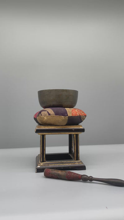 A small sized vintage Japanese orin, also known as a singing bowl. This piece includes a purple cushion (orin-dai), as well as a striker (bachi) and a wooden stand (rindai).